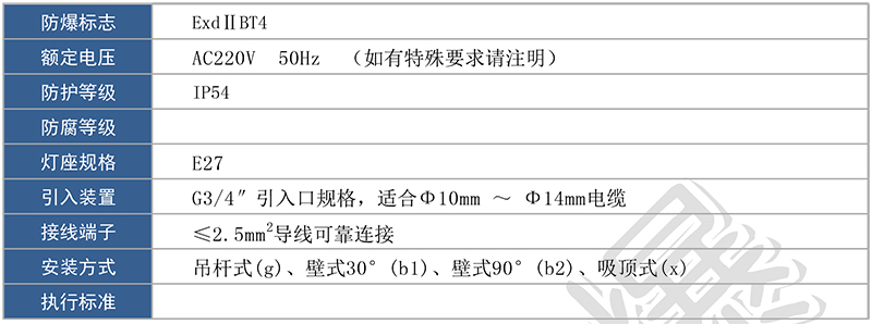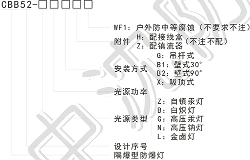 > 按照產(chǎn)品型號(hào)規(guī)格說(shuō)明逐條選擇并注明防爆標(biāo)志,例如:需要金鹵燈 100W,吸頂式安裝則產(chǎn)品選型為:CBB52-L100X ExdⅡBT4;