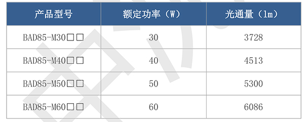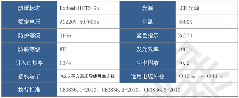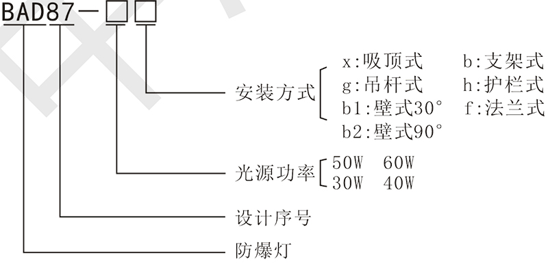 > 按照產品型號規(guī)格說明逐條選擇并注明防爆標志,例如:需要防爆 LED 燈 50W 規(guī)格,吸頂式安裝,則產品型號為 BAD87-50x ExdembⅡCT5 Gb。